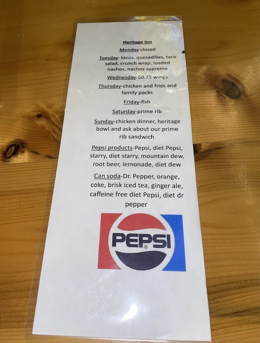 The Heritage Inn Menu